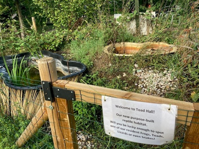 The entrance way is wide and there is a surfaced path around the site plus no steps, making it fairly accessible, although parts of the site are uneven (as part of the re-wilding approach) and therefore those with restricted mobility should take care if leaving the path.