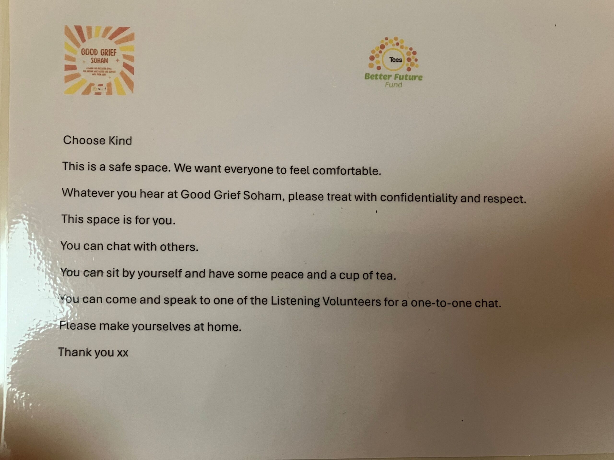 On the snack table and dotted around the room, you'll find information about other sources of support with your grief. Also displayed is the laminated document shown above, which offers some helpful group guidelines including the need for assumed confidentiality and respect.